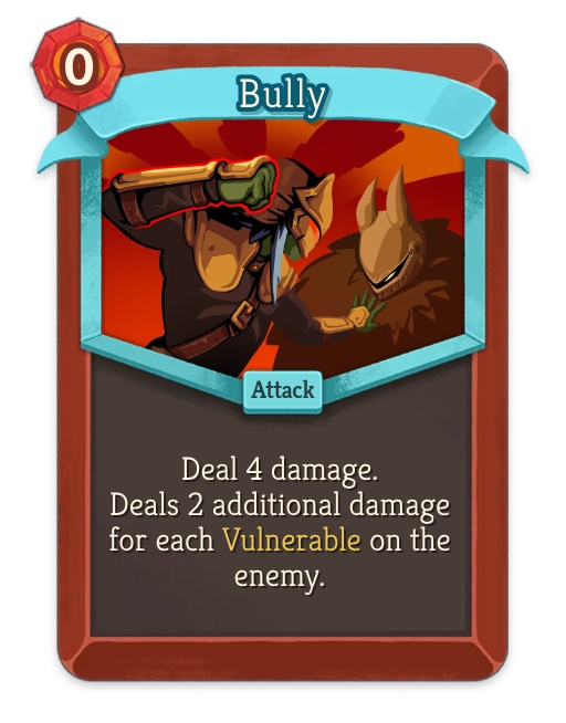 - Payoffs: Bully (scales with Vulnerable stacks), Cruelty (deals extra damage to Vulnerable enemies), Colossus (take 50% less damage from Vulnerable enemies).