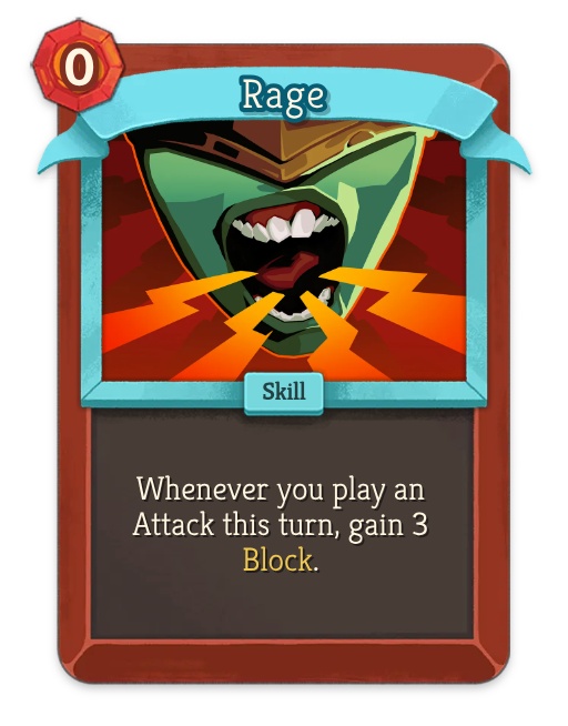 - Support: Rage (gain block for every attack, turning your offense into defense). Battle Trance (draw into your attacks).